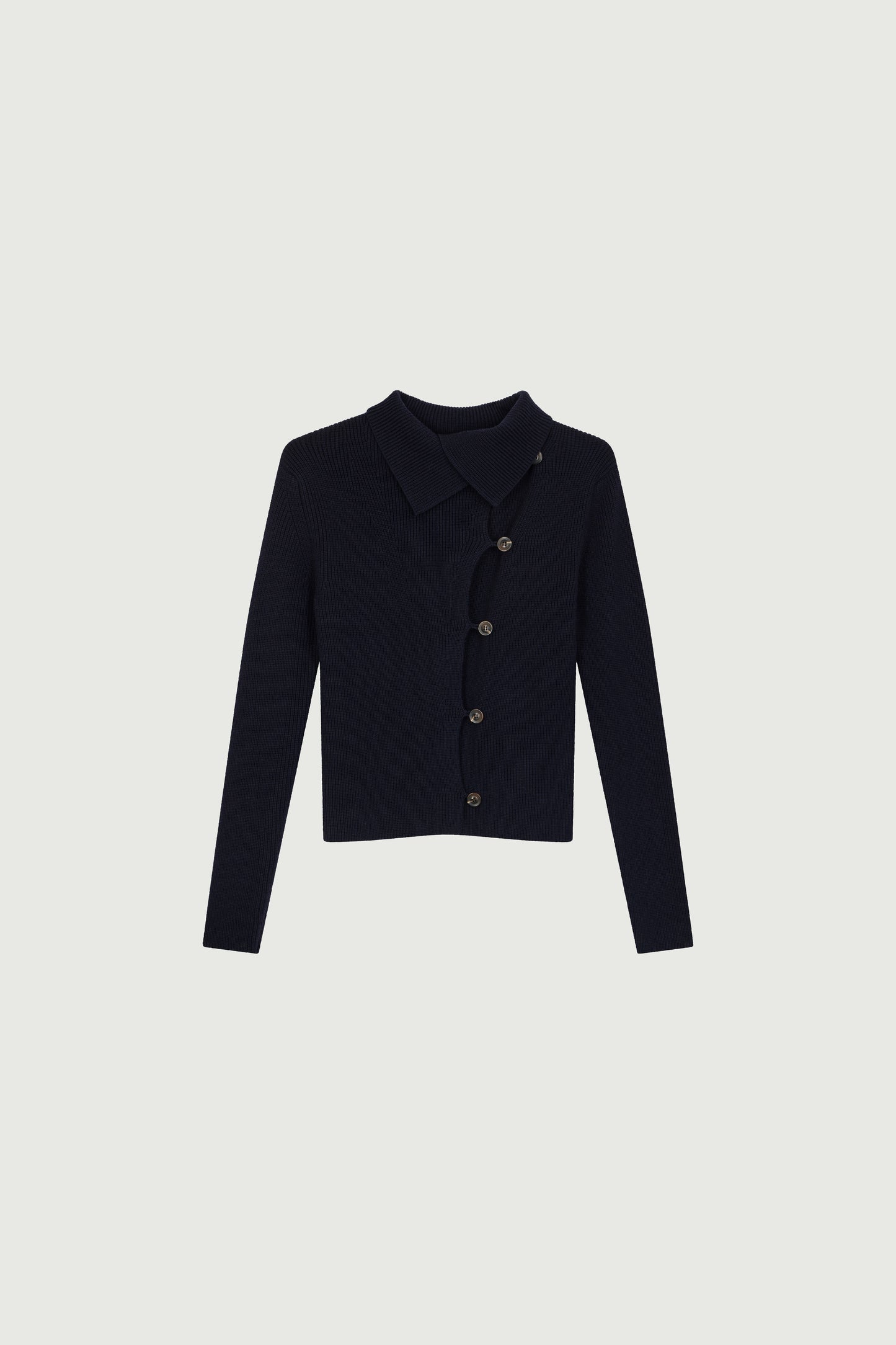 WIMY is a fitted ribbed knit cardigan. Numerous buttons allow for an adjustable collar, to be worn high or open. It can be worn directly on the skin as a cardigan or layered as a lightweight jacket. It is part of our monogram "S" embroidered line. This version is made from fine and warm merino wool.
