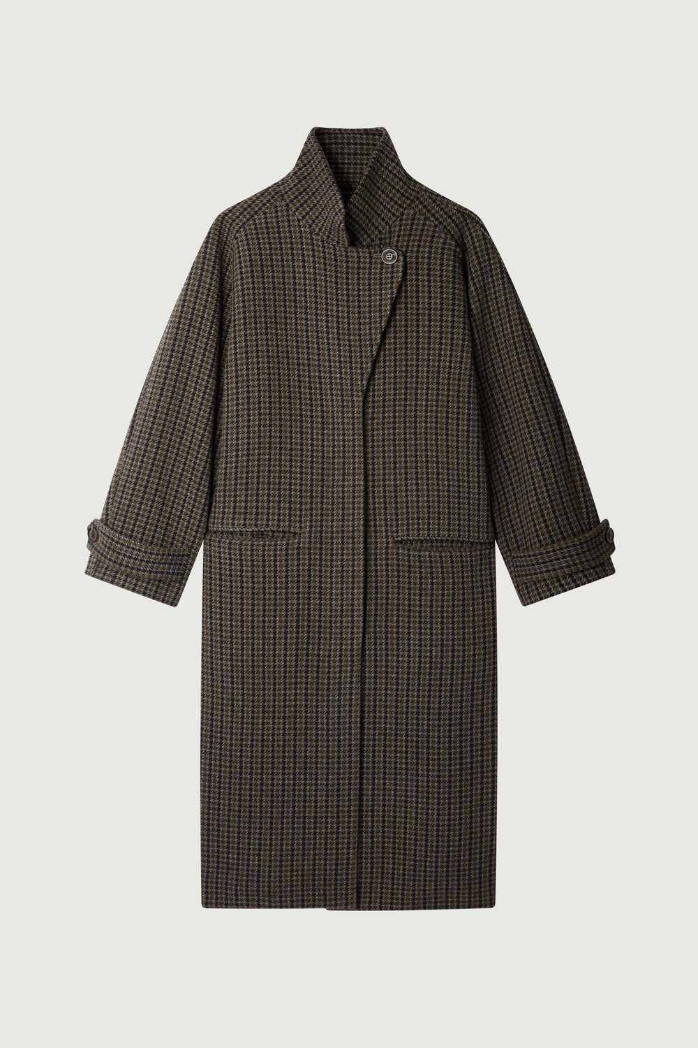 OSCAR is a long checked wool tweed coat. It features raglan sleeves for optimal comfort and a versatile collar that can be worn open or closed. The opening with hidden button placket ensures an elegant finish, while the two piped front pockets add a practical and sophisticated touch.