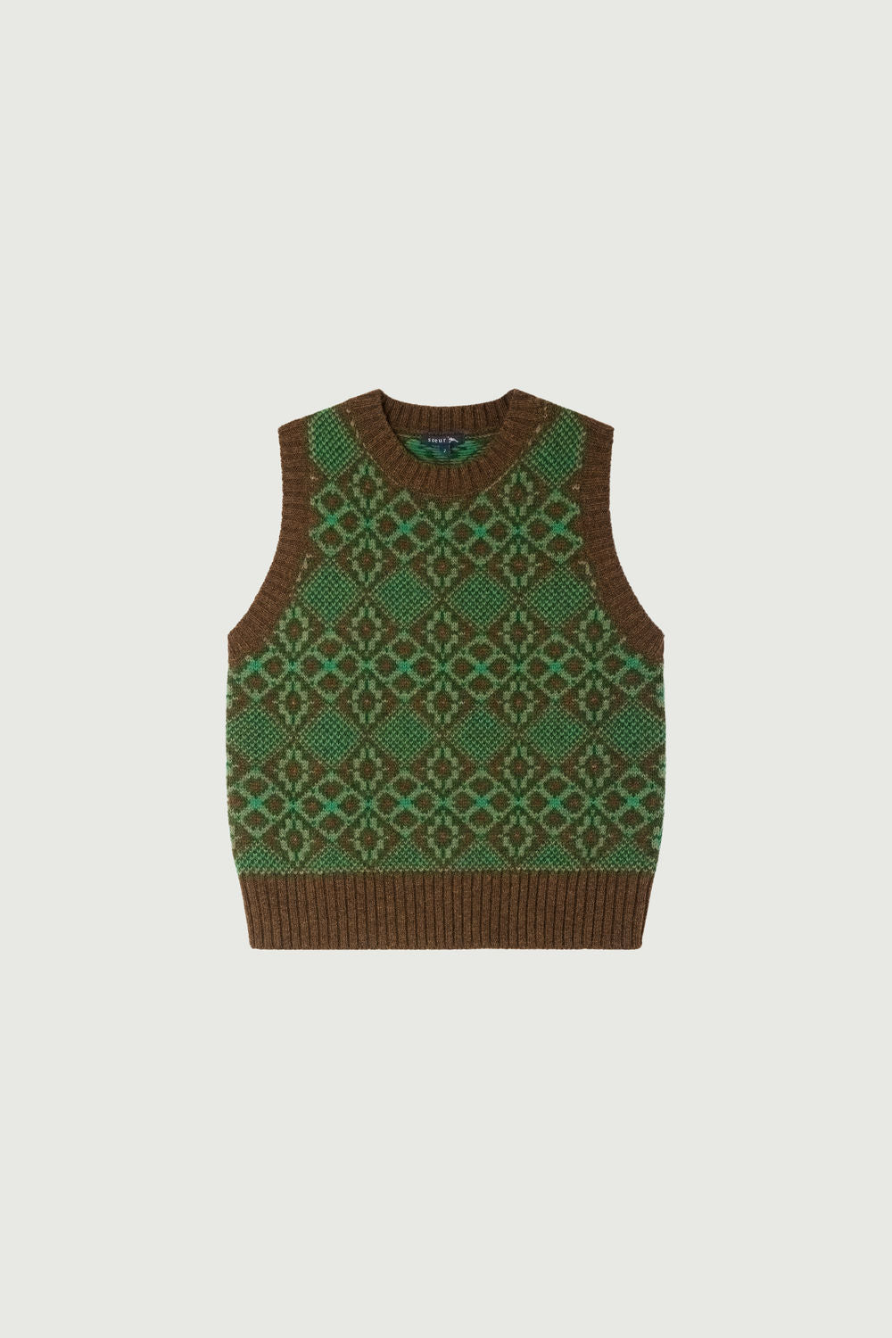 NAMASTE is a sleeveless jumper made from alpaca and wool, a true icon of our collections. Its straight cut and round collar offer a clean, minimalist look. Perfect for layering over a shirt or T-shirt, it becomes a reinvented classic. This winter, it comes in an English-inspired brown and green jacquard.